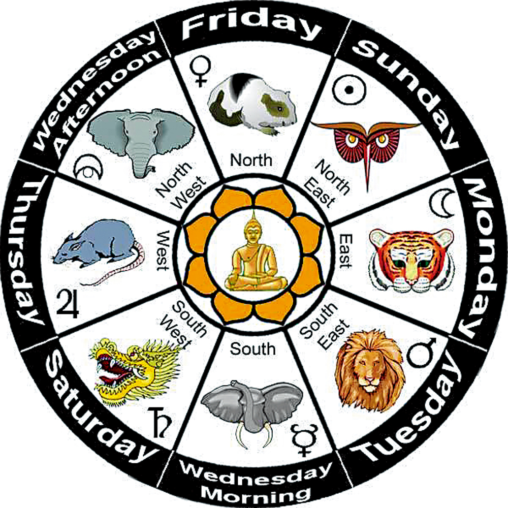 談緬甸的生肖,首先得從緬甸的星象說起,緬甸有八個「星相日」,才對應產生出緬甸的八個生肖。例如星期日叫日曜日,星期一叫月曜日……特別之處在於星期三,緬甸人把星期三又分成上下兩個半天,上午叫水曜日,下午則叫羅睺曜日。其中「羅睺」是古印度傳說中的惡魔,搶奪太陽和月亮的光輝,製造出日、月食。正因為有了這八個「星相日」,才對應產生出緬甸的八個生肖。這八個生肖分別是:星期一屬虎(月亮),星期二屬獅(火星),星期三上午屬象(水星),星期三下午屬無牙象(羅睺星),星期四屬鼠(木星),星期五屬天竺鼠(金星),星期六屬龍(土星),星期日屬金翅鳥(太陽)。根據自己出生在星期幾,緬甸人就可以確定自己是什麼生肖。