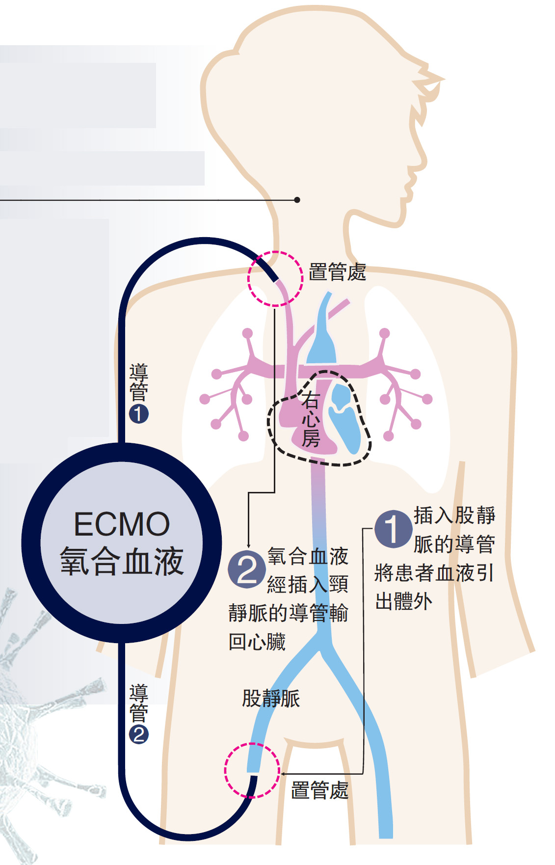 優點─當患者的肺功能嚴重受損,對常規治療無效時,ECMO可以承擔氣體交換任務,使肺處於休息狀態,為患者的康復獲得寶貴時間。同樣患者的心功能嚴重受損時,血泵可以代替心臟泵血功能,維持血液循環。