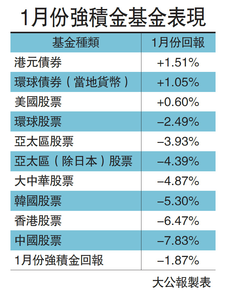 一眾基金之中,股票基金除美國仍錄得0.6%增長外,其他全線「見紅」,尤以除內地及香港股票基金為重災區外,韓國股票基金亦錄得5.3%的負增長,亞太區(除日本)及大中華股票基金亦錄得逾4%的負增長。相對股票基金,債券基金表現明顯跑贏大市,港元債券基金上月賺1.51%,為表現最好的基金,其次為環球債券(當地貨幣),亦錄得1.05%的增長。