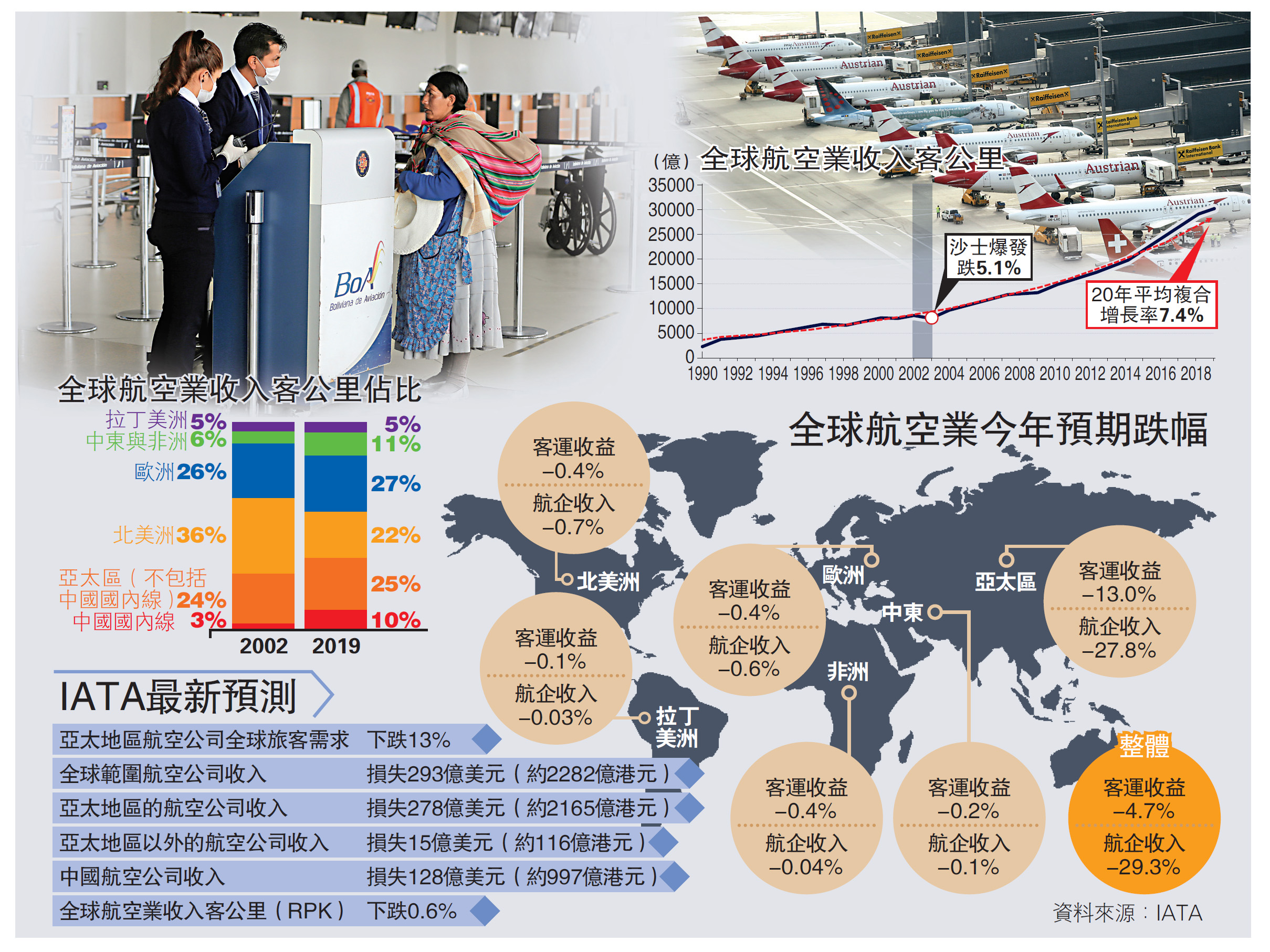 IATA表示,亞太地區航空公司的全年旅客需求將可能減少13%,一反此前預測的該地區將增長4.8%,且為金融危機以來的首次下降。協會預計亞太地區的航空公司將損失278億美元的收入。全球範圍來看,預計航空業在2020年將損失約293億美元(約2282億港元)的收入。