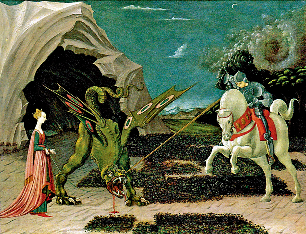 聖喬治屠龍不僅是自中世紀流傳下來的最神奇的聖人傳說之一,還是西方藝術史中經久不衰的創作題材。其中活躍於文藝復興初期的保羅.烏切洛《聖喬治與龍》,無論構圖和造型都堪稱此主題最具代表性的版本。畫作以極富想像力的、如中世紀插圖般略顯「卡通」的表現手法詮釋了這一家喻戶曉的傳說。左側的公主將已被其腰帶拴住的龍從岩洞中牽出,而右邊身騎白馬披着鎧甲的聖喬治則將長矛刺向張牙舞爪的惡龍,他身後漩渦狀的風暴則凸顯了傳說的奇幻性。值得注意的是,側面示人的公主是以中世紀傳統的二維平面所繪製;而她身旁的惡龍和騎馬的聖喬治則採用了具有科學性的三維前縮透視法。