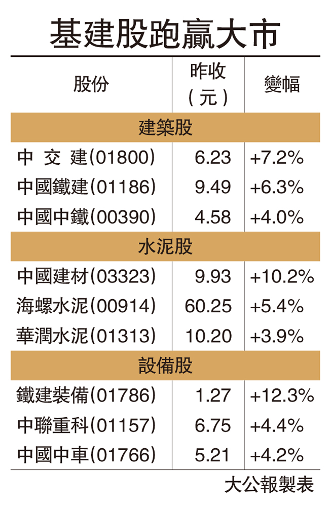 個股表現方面,基建股再度「開車」。建築股中交建(01800)股價升7.2%,報6.23元;中鐵建(01186)股價升6.3%,報9.49元;水泥股愈升愈有,中建材(03323)股價大漲10.2%,報9.93元;海螺水泥(00914)股價升5.4%,報60.25元。鋼材股亦造好,鞍鋼股份(00347)股價升6.1%,報2.76元。設備股中國中車(01766)股價升4.2%,報5.21元。消息面方面,有媒體統計內地7個省市的大型工程項目計劃,涉及規模達25萬億元人民幣。