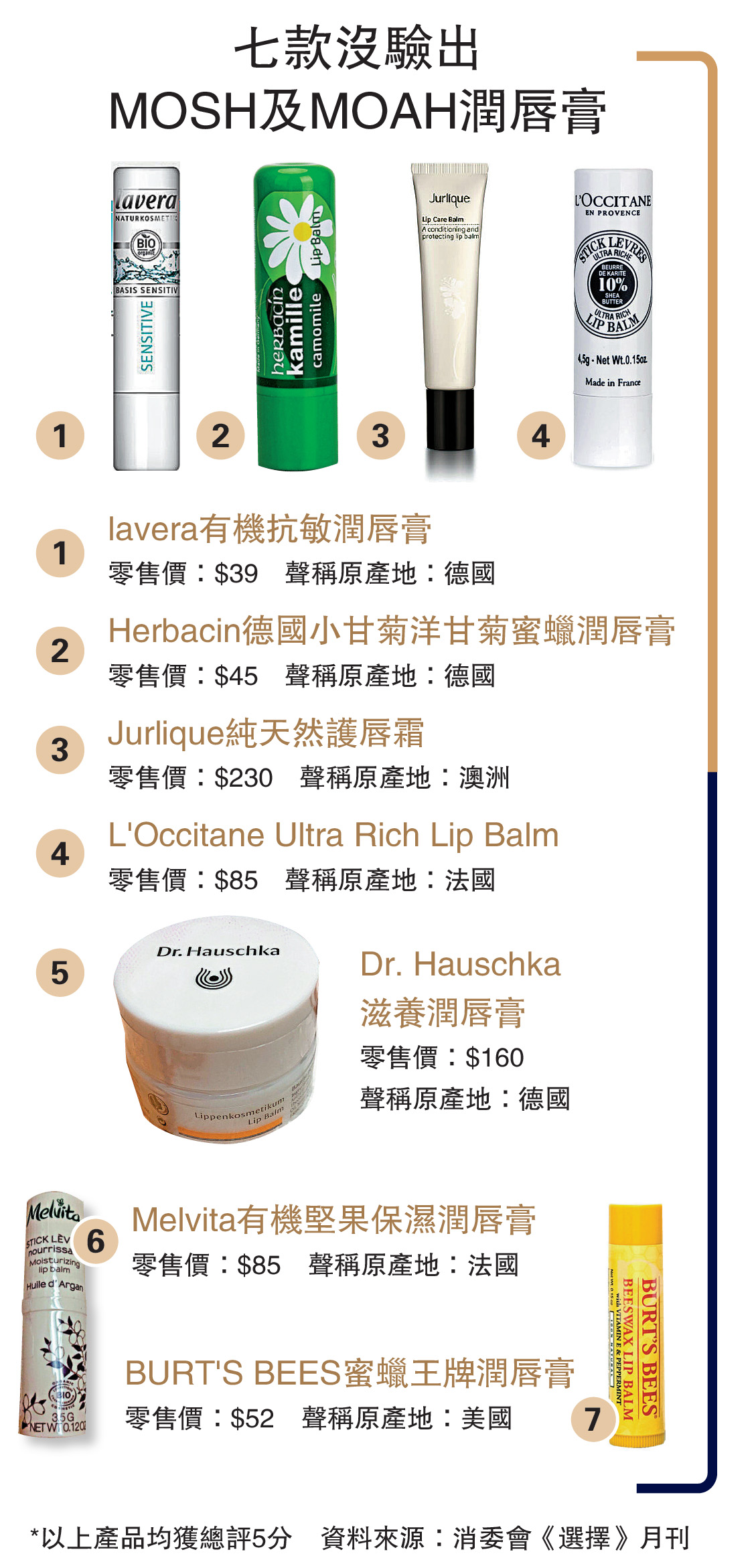 據消委會測試結果顯示,多達36款潤唇膏驗出含礦物油物質混合物MOSH,當中13款的MOSH總量超過30%。有五款驗出的短鏈MOSH混合物,超過德國相關行業建議的5%含量上限;有14款驗出的長鏈MOSH混合物,未符合歐洲消費者組織的10%建議安全限值。