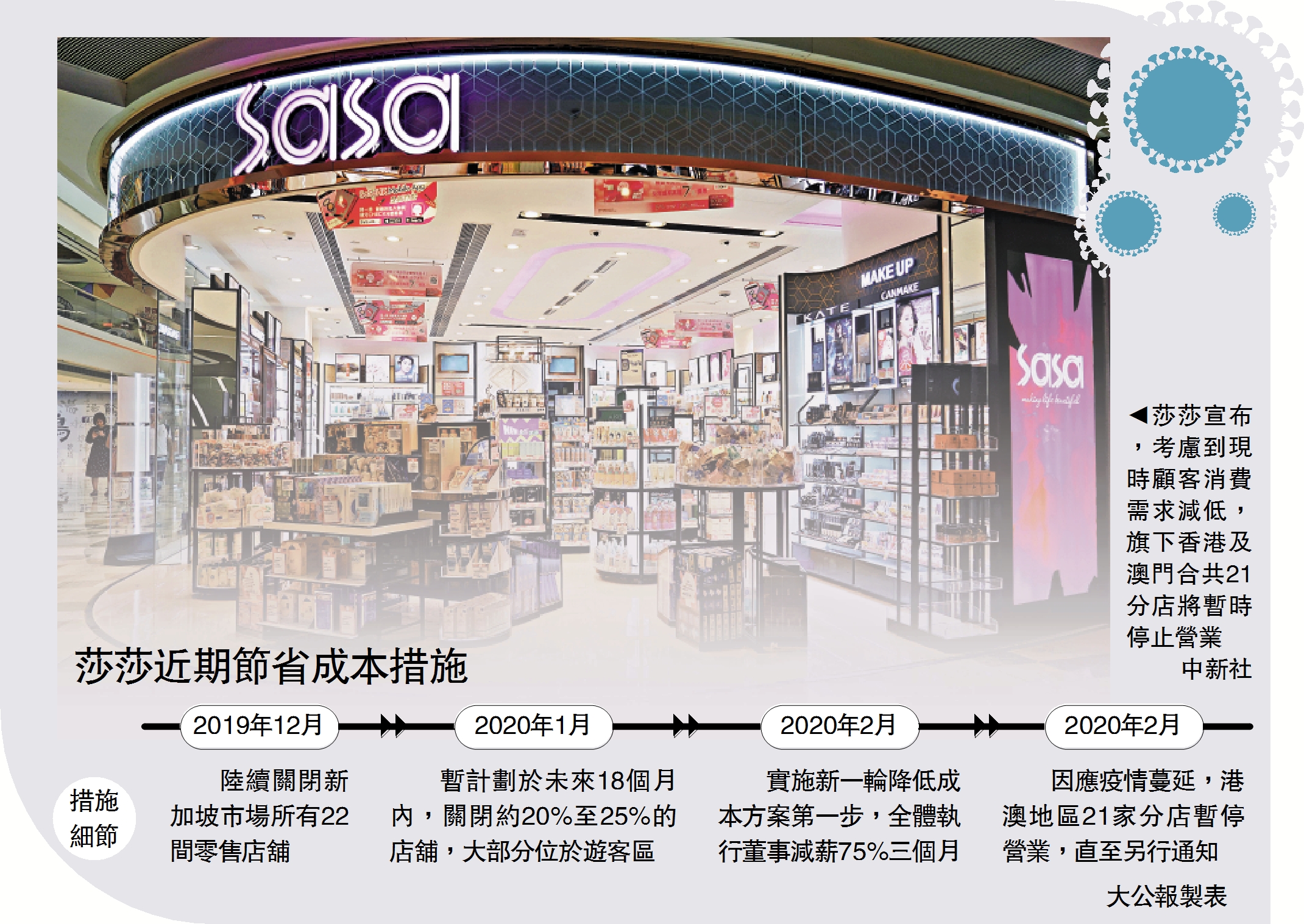 莎莎突然宣布,為保障員工及顧客安全,加上考慮到現時顧客消費需求減低,莎莎旗下香港及澳門合共21分店,已暫時停止營業,直至另行通知為止。其中,香港佔18間,包括銅鑼灣及中環合共4間,旺角及尖沙咀合共6間,另新界區有8間,佔現有港澳門店約兩成。