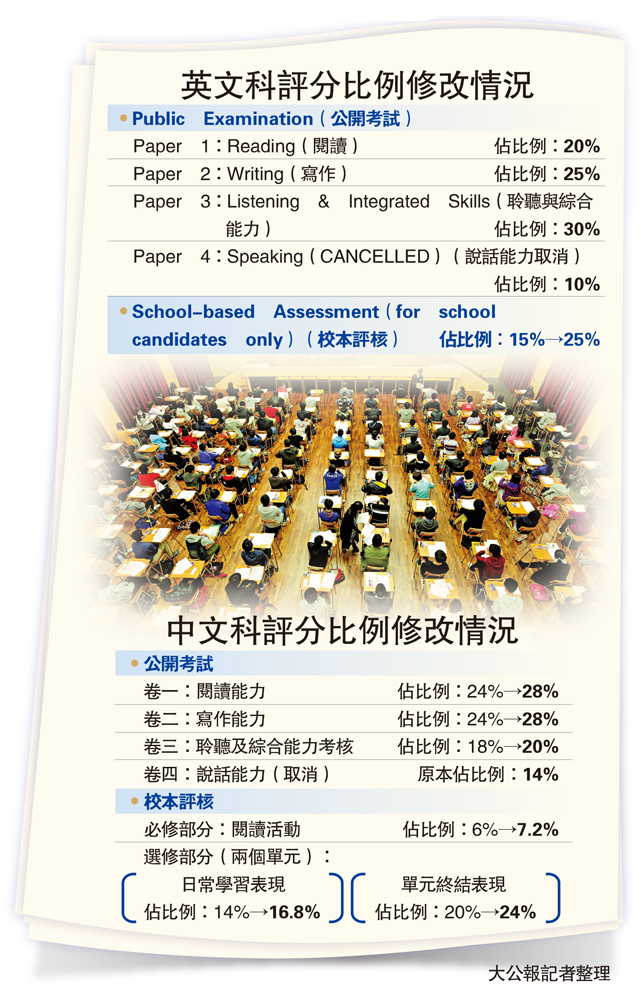 【大公報訊】記者楊天智報道:政府日前宣布2020年中學文憑試(DSE)筆試延至4月24日開考,中英文科口試取消。考評局昨日公布DSE中文科及英文科修訂後的評核大綱,英文科口試所佔的10%將加至校本評核,修訂後校本評核將佔25%,其餘各卷比重維持不變。而中文科口試所考核的能力,與其他卷別並不相同,取消口試後,說話分部將會取消,故需按比例調整其餘各卷的比重。