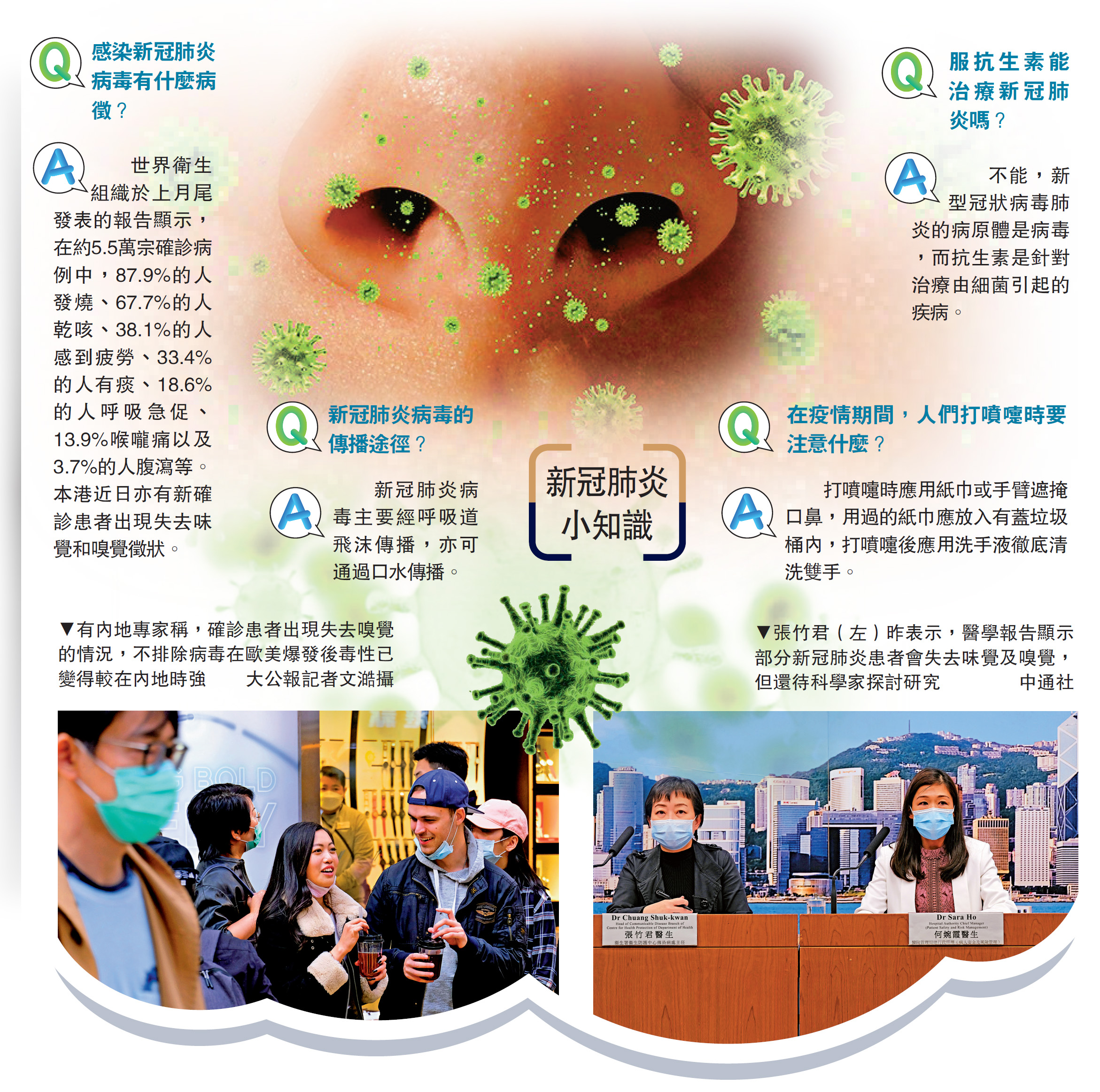 至少有十名本港新冠肺炎確診患者出現失去嗅覺、味覺的病徵,大部分從英、美回港。本港專家表示,一般傷風感冒或過敏性鼻炎都會影響嗅覺,暫不能確定以上病徵是否由新冠病毒引起。有內地專家不排除在歐美爆發的病毒,毒性比較在內地爆發的更強。\大公報記者 練怡蘭、謝瑩瑩