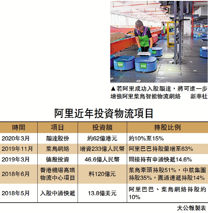 【大公報訊】記者李潔儀報道:阿里巴巴(09988)持續加大對物流行業的投資,最新計劃入股速遞公司韻達最少10%股份,總值涉及約62億港元。交易一旦落實,意味內地物流界「三通一達」均有阿里影子,進一步增強阿里菜鳥智能物流網絡的王國。