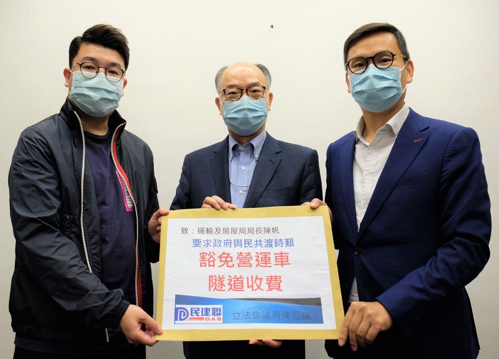 民建聯立法會議員陳恒鑌及劉國勳昨日聯同運輸業代表,約見運輸及房屋局局長陳帆,要求當局豁免營運車政府隧道收費及減免私家車隧道收費五成。民建聯指出,疫情肆虐下,運輸業收入銳減,巴士客量更大幅縮減四成。民建聯建議,政府應帶頭免收所有營運車的政府隧道收費,包括專營巴士、的士、小巴及貨車等,同時私家車的收費亦應減半。他們又促請政府與大欖隧道及西區海底隧道的營運商,商討減收隧道費半年。