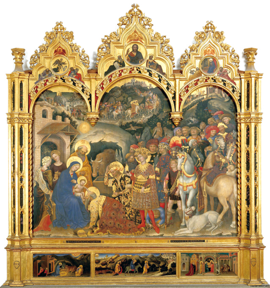《三王來朝》不僅充分展現了國際哥德風格中典型的奢華服飾和精緻裝飾性,畫家還在堆積在前景的朝聖隊伍中生動地插入了豹子、鷹、猴子、駱駝等三王從遠東帶來的珍禽異獸,此炫技方式在豐富敘事情節之餘,更暗指贊助人斯特羅奇的富有——他以當時手工業者六倍月薪的價格委約畫家完成了這件被視為意大利國際哥德繪畫風格範本的藝術瑰寶。