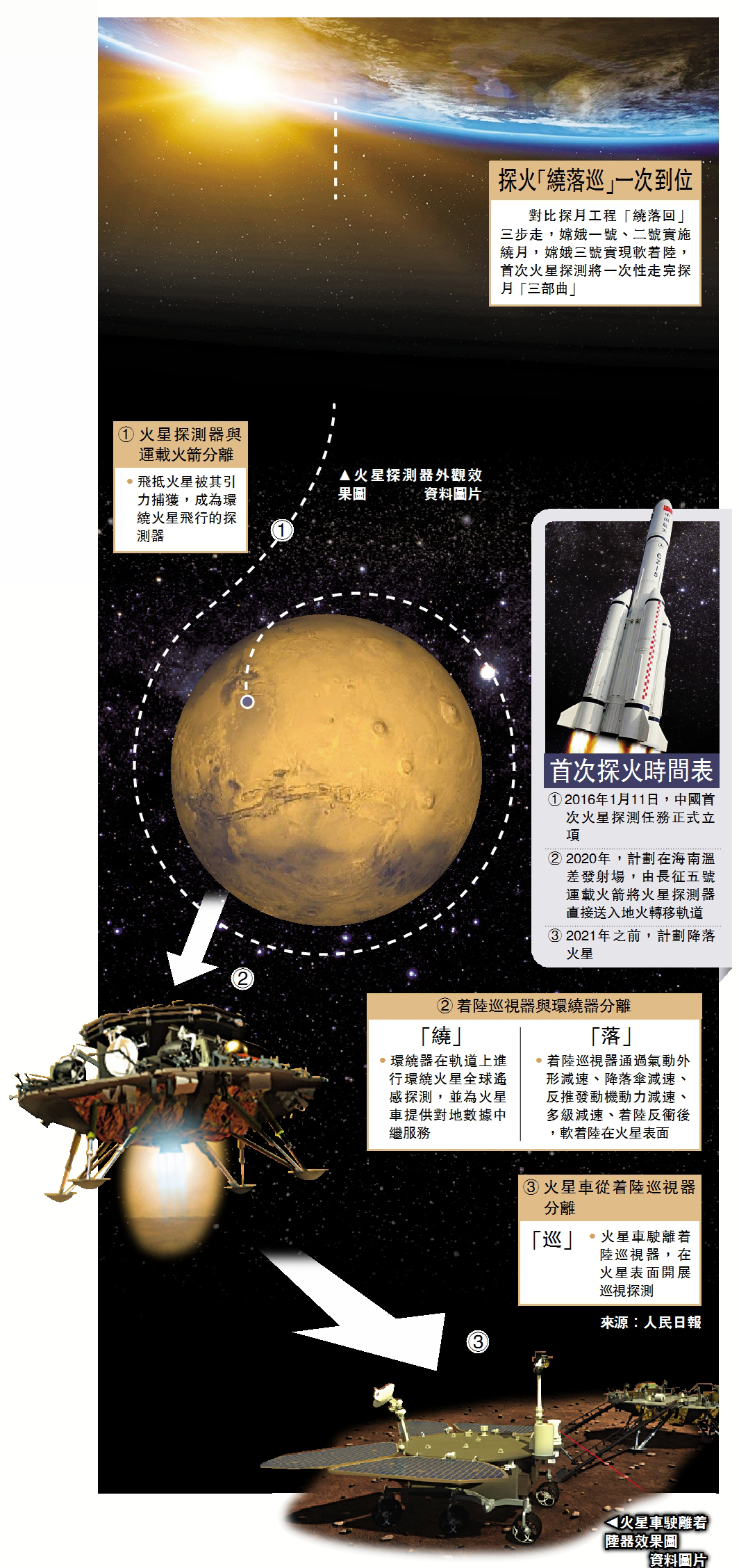 4月24日第五個中國航天日之際,國家航天局宣布中國首次火星探測任務命名為「天問一號」,源於屈原長詩《天問》,同時發布了象徵「攬星九天」的任務標識。據此前消息,中國首次火星探測預計今年7月實施,由長征五號遙四火箭在海南文昌發射場發射,通過一次發射任務實現火星環繞和着陸巡視,開展綜合探測。這將是全世界第一次在一次任務當中完成「繞落巡」三個目標。\大公報記者 周琳北京報道