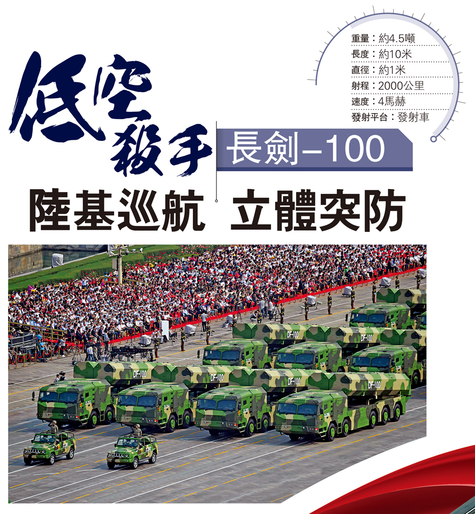 長劍-100是中國第一款陸基超音速巡航導彈,也是最新型第三代新型巡航導彈,在國慶閱兵中首次亮相。