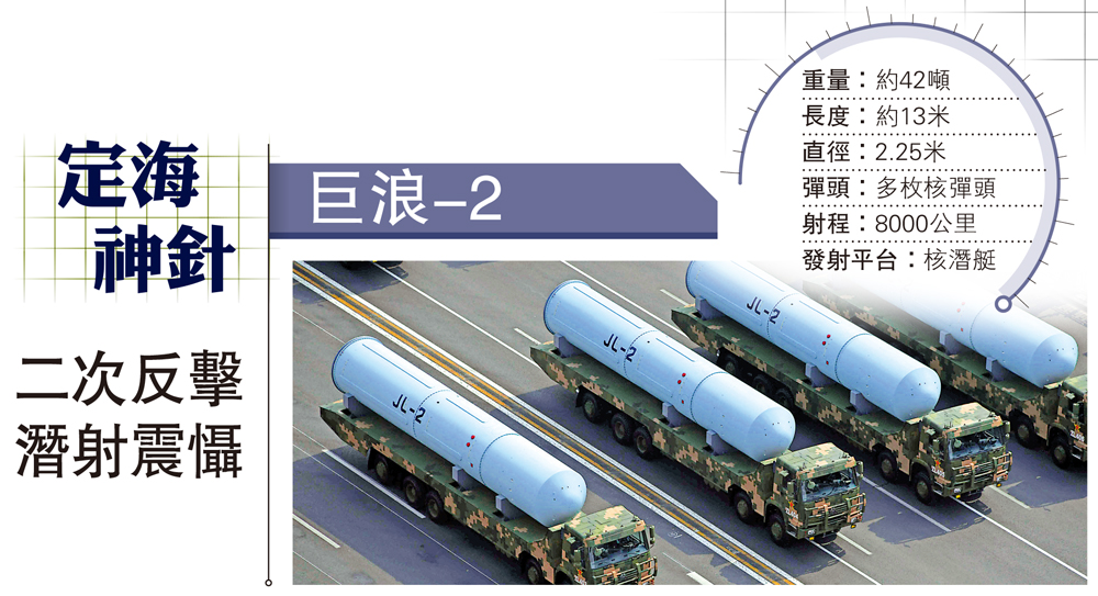 巨浪-2是三段固體燃料推進火箭,彈長約13米,彈徑2.25米,總重量約42噸,射程可達8000公里。巨浪-2導彈於2014年前後進入戰備服役階段,具備多彈頭分導能力,與094A型戰略核潛艇搭配,堪稱中國最強大的武器之一。每艘094核潛艇可搭載12枚巨浪-2。
