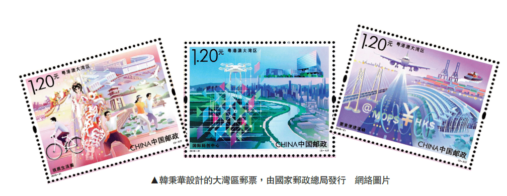 值得一提的是,在本次展覽舉行的同時,由國家郵政總局發行的首套粵港澳大灣區的專題郵票和郵品正式出版,設計者也正是韓秉華。近年來在郵票設計領域,韓秉華的作品多次被選中,包括「香港回歸祖國二十周年」紀念郵票等。