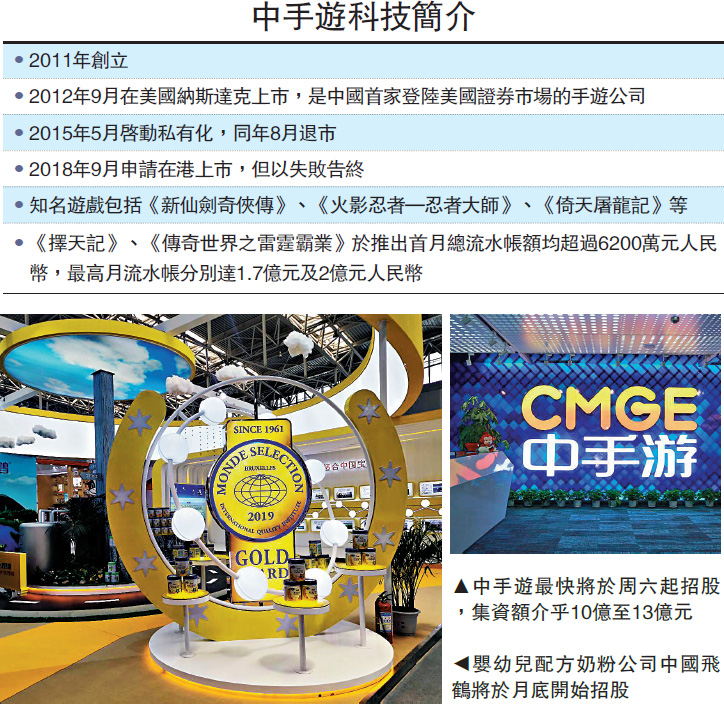 【大公報訊】曾於2018年9月申請港股上市的中手遊科技,趁近期本港新股市場回暖,再度衝擊本港新股市場,根據外電報道,中手遊最快將於周六起招股,中金公司及法國巴黎銀行為聯席保薦人,招股價由2.19元至2.83元,發售4.61億股,集資額介乎10.1億至13.05億元。