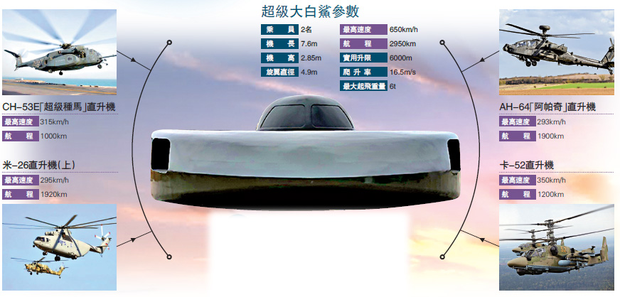 一款外形酷似UFO飛碟、名為「超級大白鯊」的武裝直升機模型日前亮相第五屆中國天津國際直升機博覽會(下稱直博會)。這款針對未來數字信息化戰場設計出來的複合式翼身融合高速直升機構型,引起美、英、俄等國家高度關注,也引發了人們對未來直升機的猜想。據公開數據,「超級大白鯊」武裝直升機最大平飛速度為每小時650公里。據悉,翼身融合設計降低機體與空氣的摩擦阻力,有利亞音速飛行。
