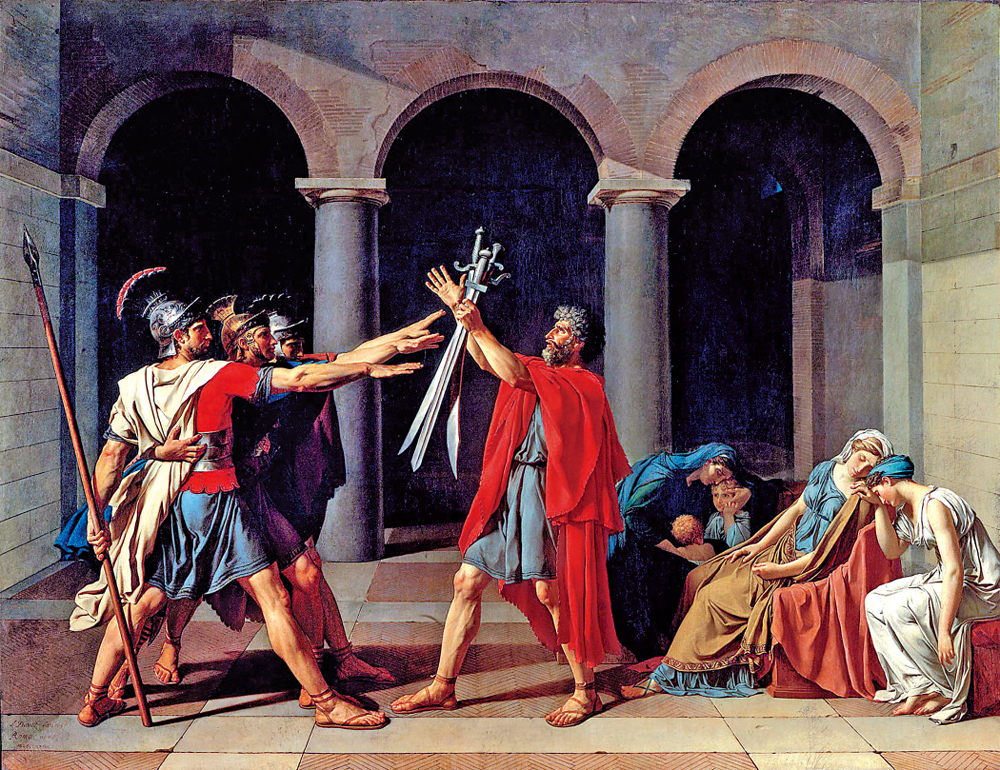 在巴黎羅浮宮德農館702展廳中,新古典主義巨匠雅克.路易.大衛的多幅名作在此集中呈現,其中便包括其代表作之一《賀拉斯兄弟的誓言》。畫作描繪了公元前七世紀古羅馬的賀拉斯家族三兄弟準備與鄰國阿爾巴所選出的庫里阿提三兄弟進行決鬥來解決爭端,並向持劍的父親立誓哪怕為國捐軀也在所不惜的場景。大衛巧妙地用古羅馬多立安式圓柱所構成的拱門來分隔持迥異心態的三組人:畫面焦點集中在老賀拉斯手握的三柄長劍上;左側是抬臂起誓、視死如歸的兄弟三人;右側的三位女眷神情悲戚,居中靠在椅背上的女子不僅是賀拉斯兄弟之一的妻子,還是決鬥方庫里阿提兄弟的妹妹。畫家以堅實的人物輪廓、鮮明的明暗對比、均衡的構圖及沉穩的色彩塑造出一個極富戲劇衝突的莊嚴時刻。在當時排斥輕浮造作的洛可可風格、且法國大革命一觸即發的大背景下,繪畫作品開始回歸嚴肅並強調對國家的忠誠。身為堅定的「普桑主義者」和拉斐爾崇拜者的大衛從二人的精準造型和典雅畫風中提煉出獨特的具有強烈英雄主義的畫風,並通過賀拉斯家族為了避免兩國無辜百姓更大的傷亡而選擇犧牲自我的寓意來凸顯愛國的觀念。