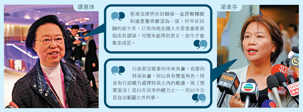 另外,郭榮鏗聲稱,今次案件完全不涉及兩地關係,即屬於香港自治範圍內的事務,因此本港法院對此案件完全有管轄權。基本法委員會委員、城市大學法律學院副教授梁美芬認為,案件涉及特首行政權,而行政長官既要向中央負責,也要向特區負責,所以具有雙重角色。特首有行政權力處理特區之內的動盪,而《禁蒙面法》是衍生出來的權力之一,所以今次是自治範圍之外的事。她認為,特區政府應繼續上訴,透過香港法庭進一步闡述理據。