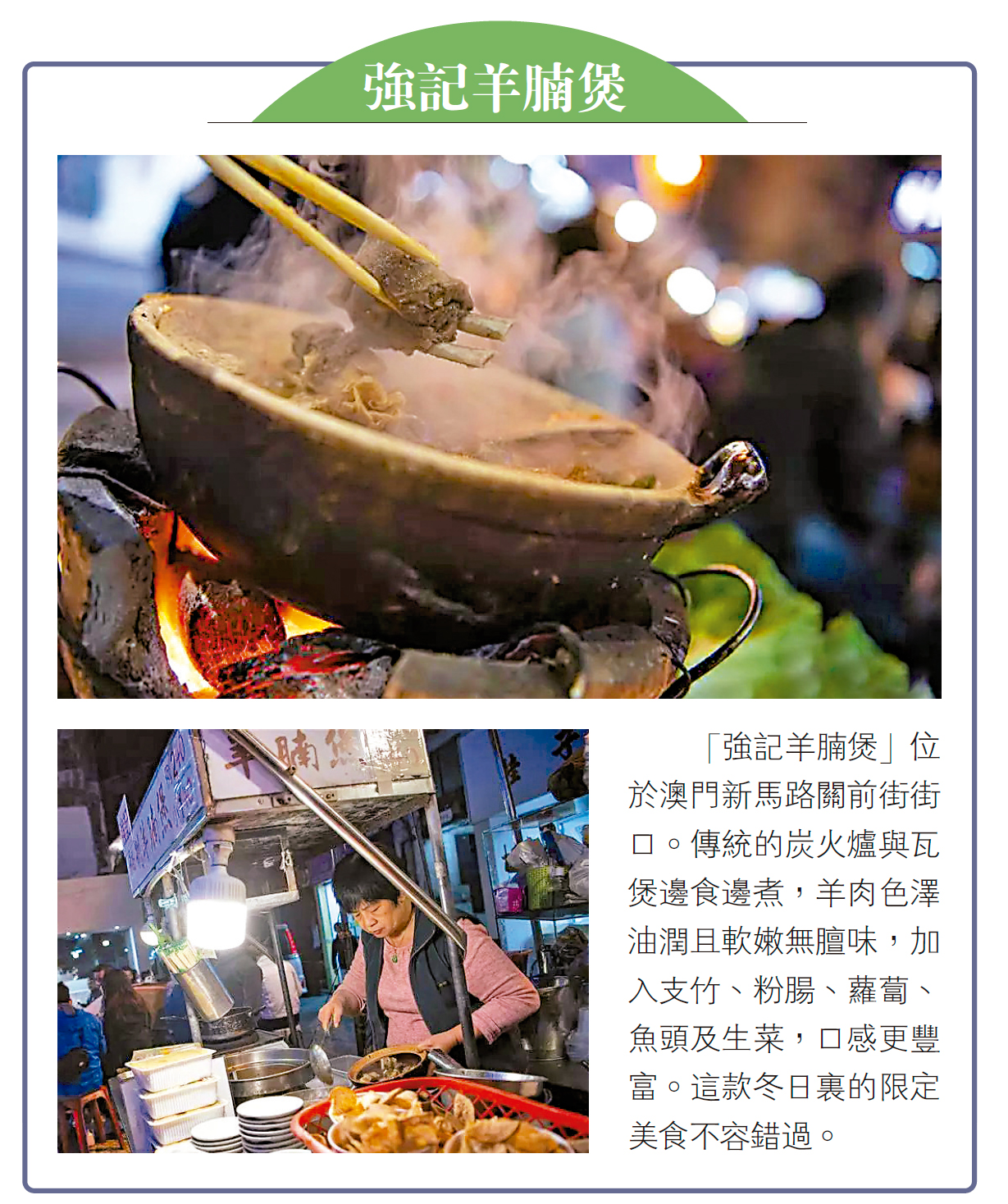 「強記羊腩煲」位於澳門新馬路關前街街口。傳統的炭火爐與瓦煲邊食邊煮,羊肉色澤油潤且軟嫩無膻味,加入支竹、粉腸、蘿蔔、魚頭及生菜,口感更豐富。這款冬日裏的限定美食不容錯過。