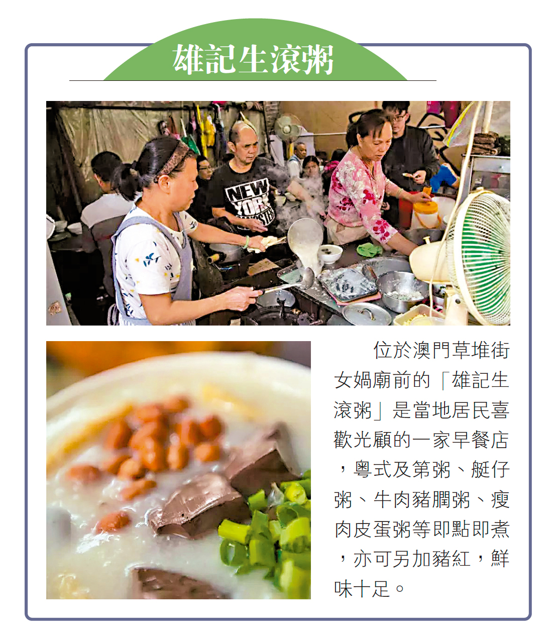 位於澳門草堆街女媧廟前的「雄記生滾粥」是當地居民喜歡光顧的一家早餐店,粵式及第粥、艇仔粥、牛肉豬膶粥、瘦肉皮蛋粥等即點即煮,亦可另加豬紅,鮮味十足。
