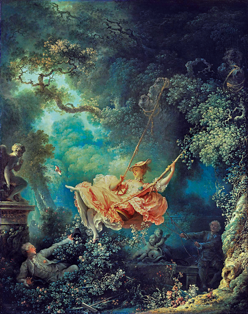 作為英國倫敦華萊士收藏中的「門面」,讓.奧諾雷.弗拉戈納爾的《秋千》不僅是其最具影響力的作品,更是最能代表十八世紀洛可可時期藝術風格的符號化經典。畫家經聖朱利安男爵的口述,受其委約描繪了這幅展現三角戀的「調情畫」。在具有華托雅宴畫特徵的湖藍色理想化風景中,光源從左上方沿對角線斜射而下,高光落在正中央坐在秋千上頭戴禮帽的粉裙少女身上。其年邁的丈夫在她背後的林中拽着秋千供其享樂,而她年輕俊美的情人正卧在她身前花叢中與之眉目傳情。少女不經意間甩出的鞋子飛向畫面左側食指對準嘴唇的邱比特雕像──意指明目張膽的勾引與不可言說的秘密,此兩處明暗對比的細節暗喻乃是點睛之筆。在十八世紀的歐洲,盪秋千時的肢體語言被視為帶有性暗示,而甩飛的鞋子則象徵着失去純真。弗拉戈納爾通過擺動的秋千塑造了一個具有倫理衝突的敘事情節,如花似玉的少女和甩至頂端的秋千均代表轉瞬即逝的感官愉悅。而畫中所傳遞出的挑逗和輕佻的低俗趣味雖與柔美輕盈、精緻甜膩的畫風形成巨大反差,卻完美映射出十八世紀洛可可時期上層社會追求華麗繁複、排斥嚴肅格調、推崇男女調情享樂主題的藝術品味。