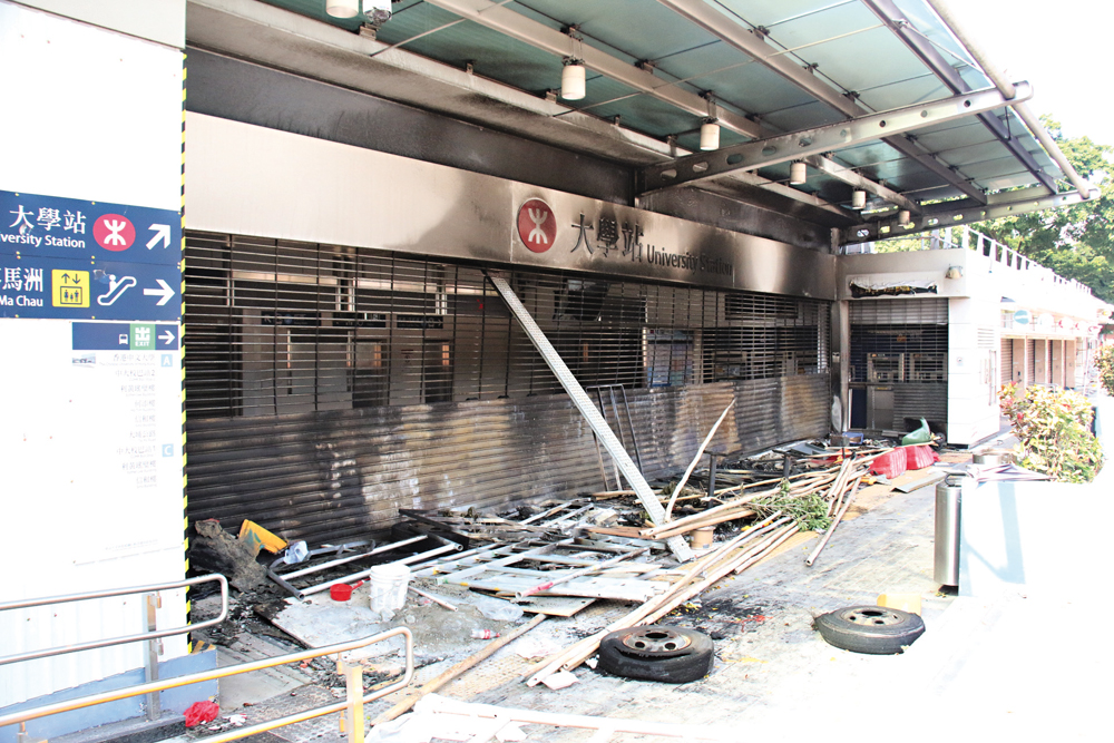 11月中文大學被佔領期間,有暴徒大肆破壞通往中大的大學車站內設施,並分別向停放在大學站及上水站的列車車廂縱火,事後大學站須關閉維修,至今重開無期。港鐵形容,大學站由於遭受龐大的嚴重破壞,需要深層次復修,近乎要重建車站。