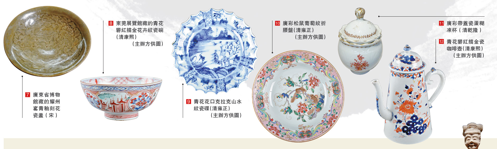 此次展覽中,清代外銷瓷器成為亮點之一。東莞展覽館藏的青花礬紅描金花卉紋瓷碗(清康熙)?是一件伊萬里風格的瓷器,講述着清代海禁解除後,中國瓷器從工藝、產量、價格和創意上優於日本,從而取代日本伊萬里瓷器的故事。