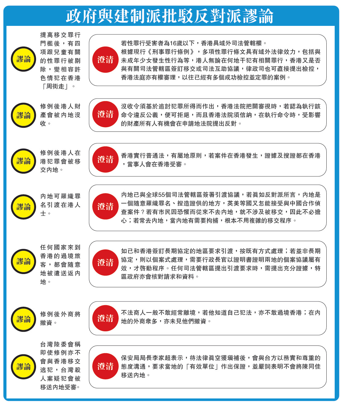 澄清:內地已與全球55個司法管轄區簽署引渡協議,若真如反對派所言,內地是一個隨意羅織罪名、捏造證供的地方,英美等國又怎能接受與中國合作偵查案件?若有市民因恐懼而從來不去內地,就不涉及被移交,因此不必擔心;若常去內地,當內地有需要拘捕,根本不用複雜的移交程序。