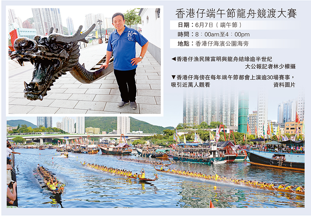 明日端午節,龍舟競渡是「重頭戲」,據說香港仔是本港龍舟競渡的發跡地,具逾百年歷史。節日前夕。土生土長的正宗「香港仔」漁民陳富明(富哥),與大公報記者細說「龍情」。富哥與龍舟結緣逾半世紀,見證龍舟由漁民傳統習俗,演變成體育競賽,同時仍保留昔日傳統禮儀及風貌。比賽當日,10艘長近百呎的「大木龍」聚首香港仔避風塘,而數十艘漁船在賽道旁列陣打氣,旗海飄揚的盛況,歷久不衰。