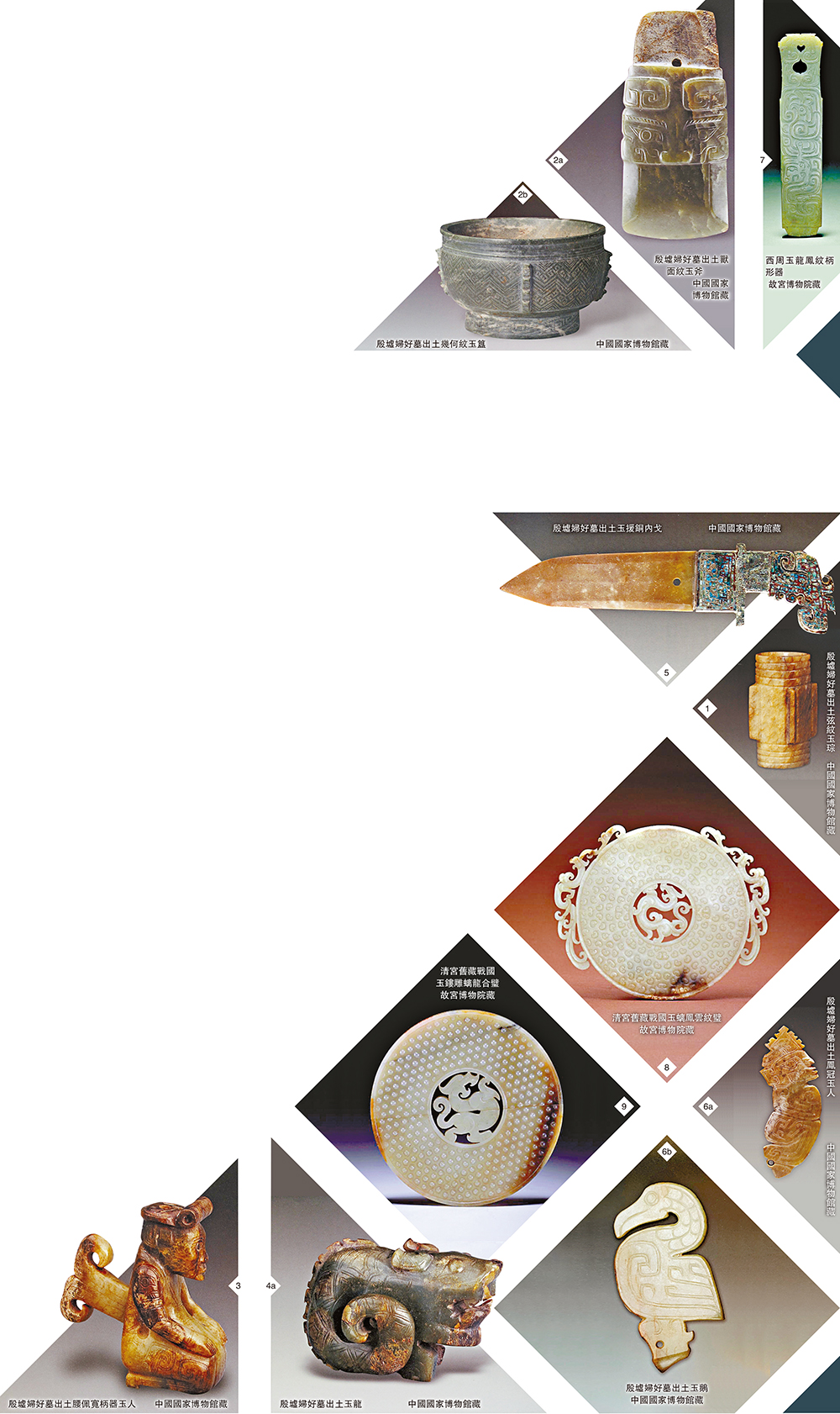 婦好墓玉器大體可分為占卜、祀鬼神使用的巫玉(圖 [1]),典禮、祀祖使用的禮玉(圖 [2a] [2b]),模仿日常生活的人物(圖 [3])、動物(圖 [4] ),還有玉兵器(圖 [5])、玉工具、玉飾品(圖 [6a] [6b])等,很多現藏國家博物館。