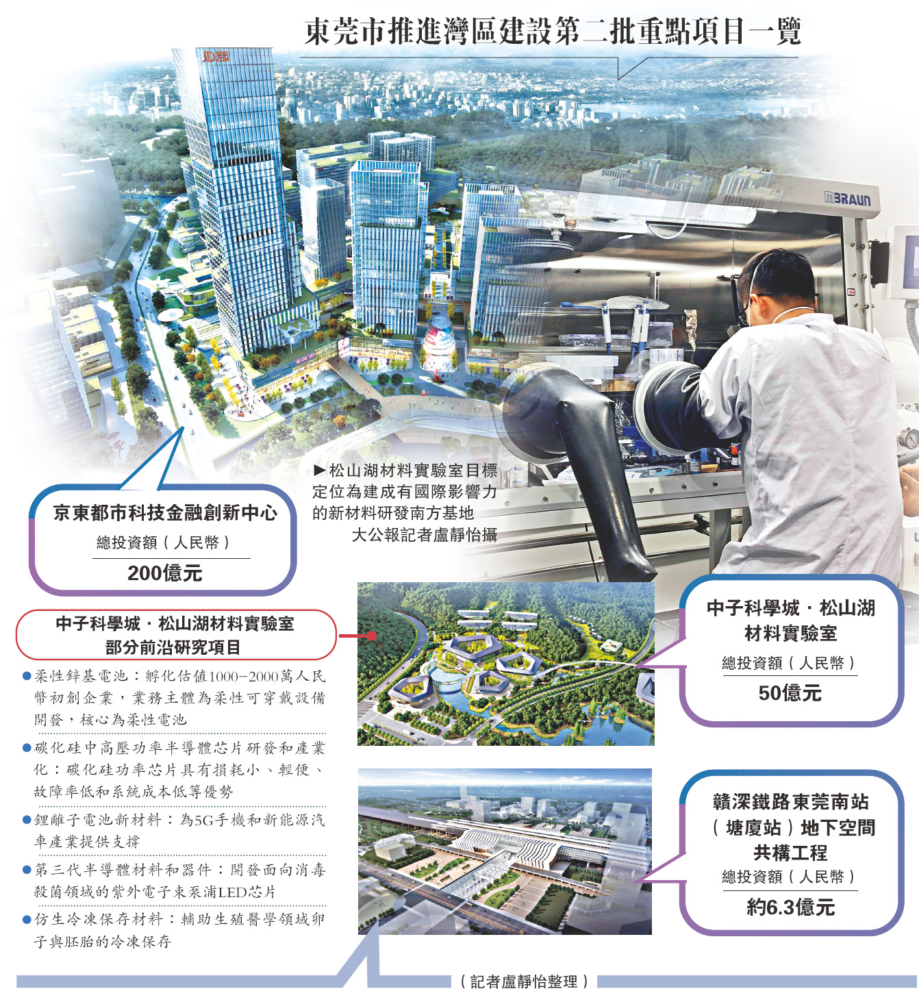 粵港澳大灣區科研能力將再上一層樓。東莞市推進灣區建設第二批重大項目17日集中動工,總投資391億元(人民幣,下同),集中開工的30個項目中產業項目佔比過半。中子科學城.松山湖材料實驗室項目當日正式動工,首期投資50億,基礎設施預計明年建成。中科院院士、松山湖材料實驗室理事長王恩哥表示,實驗室立足於成為具有國際影響力的新材料研發南方基地、國家物質科學研究中心。實驗室引進的18個創新樣板工廠科研團隊中,包括香港城大的柔性鋅基電池項目團隊。\大公報記者 盧靜怡東莞報道