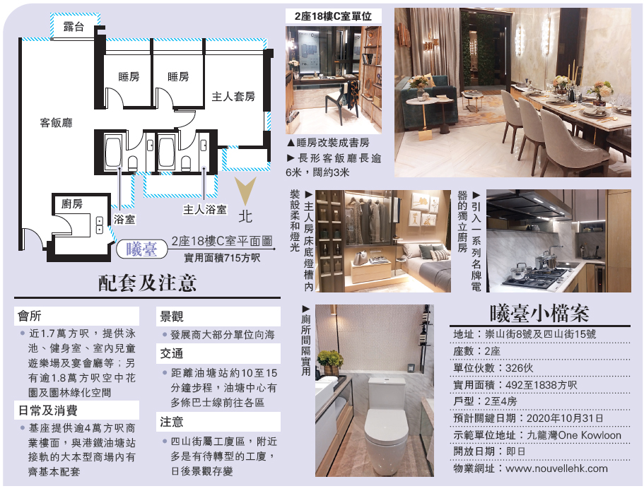 逐步由工廈區轉型住宅區的油塘,近年不少新盤湧現,其中宏安地產(01243)牽頭的曦臺,位於四山街,項目正面坐擁海景,背面及兩邊被不少工廈包圍有待銳變,項目主打兩房及三房戶,實用492方呎起,最令人意外是,全屋家電用上德國名牌Gaggenau屬意外驚喜。