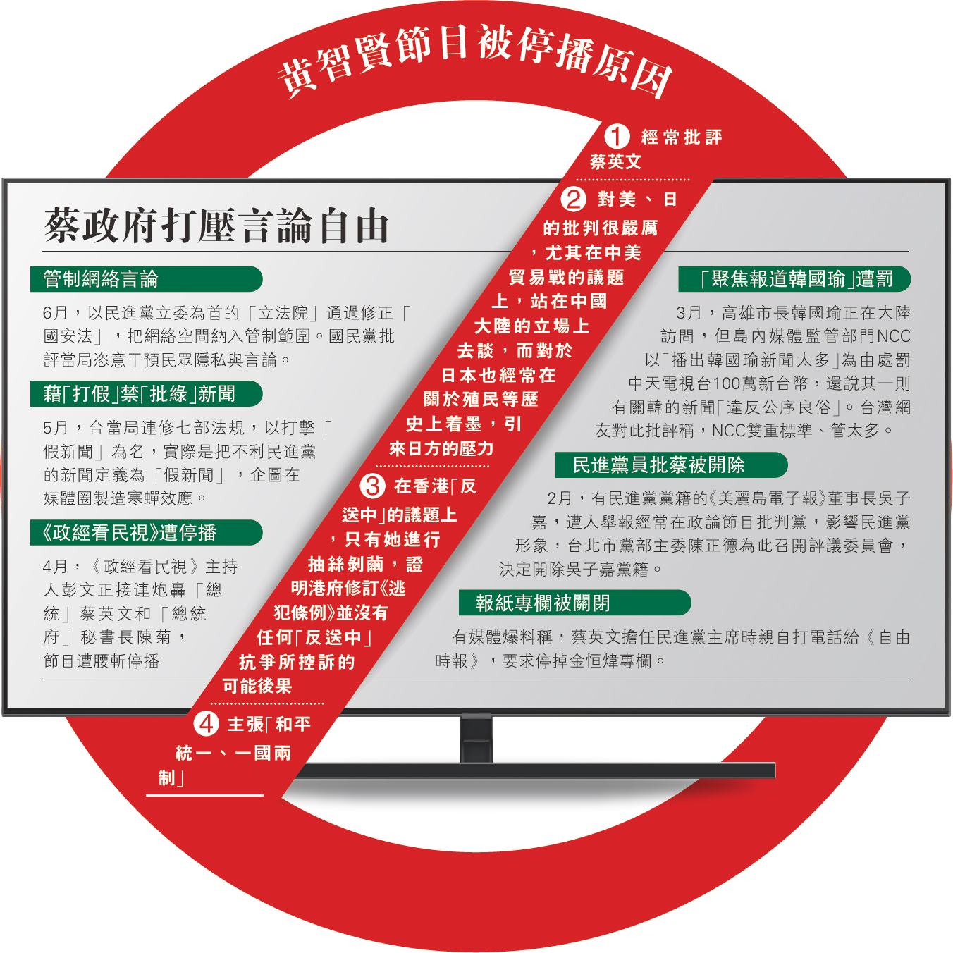 台灣知名主持人黃智賢因最近在福建出席海峽論壇上發表了支持兩岸統一的言論,受到台當局陸委會的「依法處分」──關停由其主持的《夜問打權》節目。黃智賢27日接受大公報記者採訪時證實,確實受到蔡政府的政治壓力,28日播出的《夜問打權》節目將會是最後一期。屆時她將在節目中講述大陸的崛起。有分析指出,近月島內有政論節目接連遭停播,蔡政府打壓言論自由的力度正在增加。/大公報記者 蘇榕蓉報道