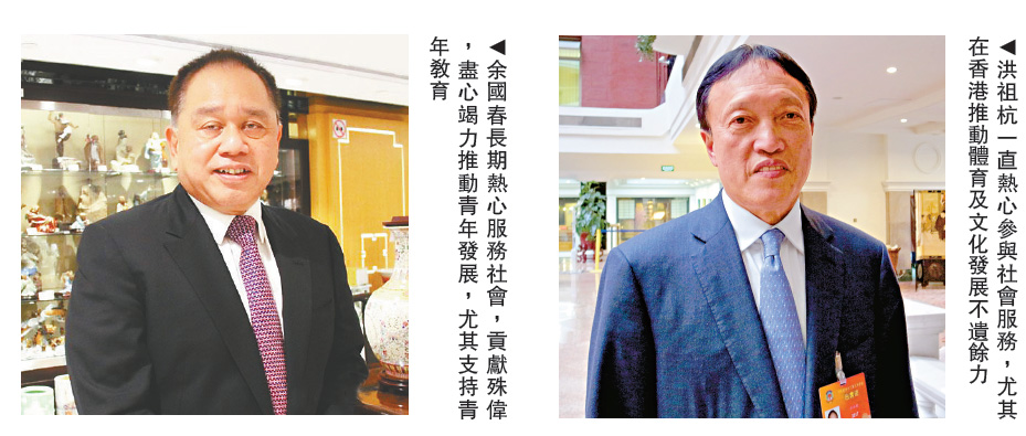 特區政府公布回歸以來第22份授勳名單,399人獲得行政長官頒授勳銜及作出嘉獎,數量是十年以來新高。香港僑界社團聯會會長余國春、南華體育會會長洪祖杭獲頒授最高榮譽的大紫荊勳章。洪祖杭昨日接受《大公報》訪問時表示,繼續努力推動體育和藝術發展,發揮社會正能量,希望社會凝心聚力,互相尊重,和諧相處。今年另有11人獲得金紫荊星章,23人獲銀紫荊星章,41人得到銅紫荊星章。頒授典禮將於11月初舉行。\大公報記者 馮瀚林 石璐杉