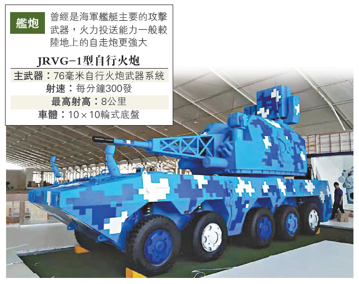 JRVG-1型自行火炮採用了優化設計的國產76毫米艦炮炮管。由於艦炮普遍尺寸巨大、後坐力強勁,一般的陸基平台都難以承載。JRVG-1型減少了炮塔尺寸,還大大提高了射速和彈藥裝載量。海軍054A型導彈護衛艦76mm艦炮射速約為每分鐘120發,而JRVG-1型達到每分鐘約300發,提高了2.5倍。從而成功實現了「艦炮上岸」。