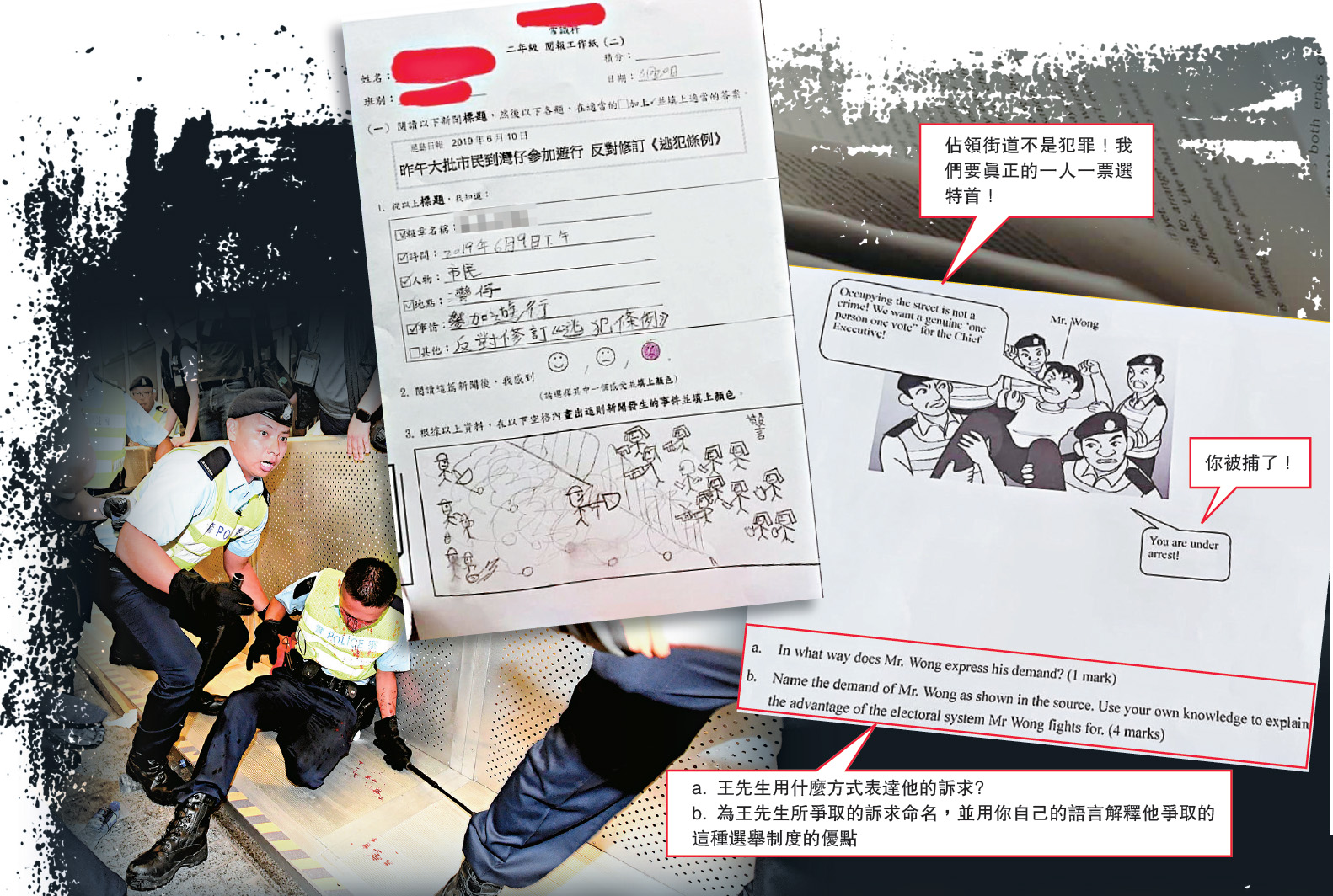 「洗腦」教育入侵校園!繼大公報早前踢爆有小學二年級常識工作紙驚現洗腦式「逃犯」題後,再有家長群組傳出來自聖士提反書院的中一試卷,當中由插圖到考題,都是街頭抗爭的內容,提問角度一面倒地偏袒暴徒,家長指責這是「全方位向學生洗腦」!此外,亦有法學博士舉報考評局通識教育委員會委員、嘉諾撒聖心書院老師賴得鐘發放仇警言論,違反專業操守,要求教育局嚴肅處理(詳見另稿)!家校合作事宜委員會主席湯修齊直言,近年收到不少家長投訴,指部分中學通識科教師偏頗,向學生灌輸個人政治思想,辦學團體、校董會及校長必須為此把關!\大公報記者 冼國強