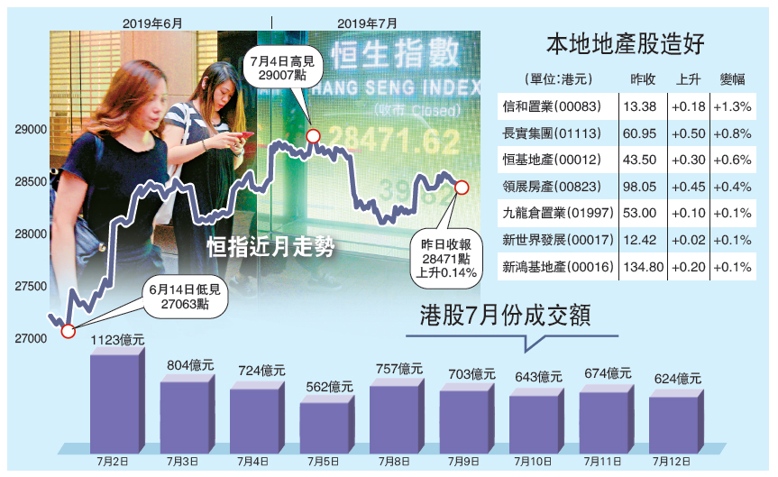 港股市場消化美國減息因素,投資者關注中美貿易談判膠着,入市意欲下降,恒指昨日反覆升39點,未能承接美股破頂的氣勢,成交額跌至624億元。本地地產股普遍造好,信和置業(00083)、長實(01113)繼續跑贏大市。內地昨日公布多項重磅數據,其間上月新增社會融資規模大勝預期,分析員認為,基建板塊近期表現疲弱,慎因社融數據而低吸基建股;後市短線或在27500點至29000點間上落。