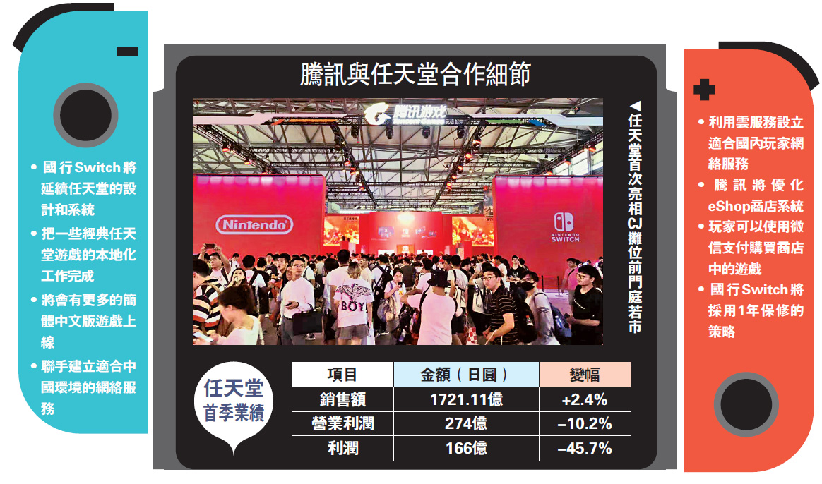 騰訊與任天堂的合作早於4月時已公布,昨日兩間公司正式將國行(中國行貨)Nintendo Switch帶給消費者。騰訊Switch項目負責人錢賡表示,國行Switch將延續任天堂的設計和系統。目前,騰訊正和任天堂合作把一些經典任天堂遊戲的本地化工作完成,未來將會有更多的簡體中文版遊戲上線。