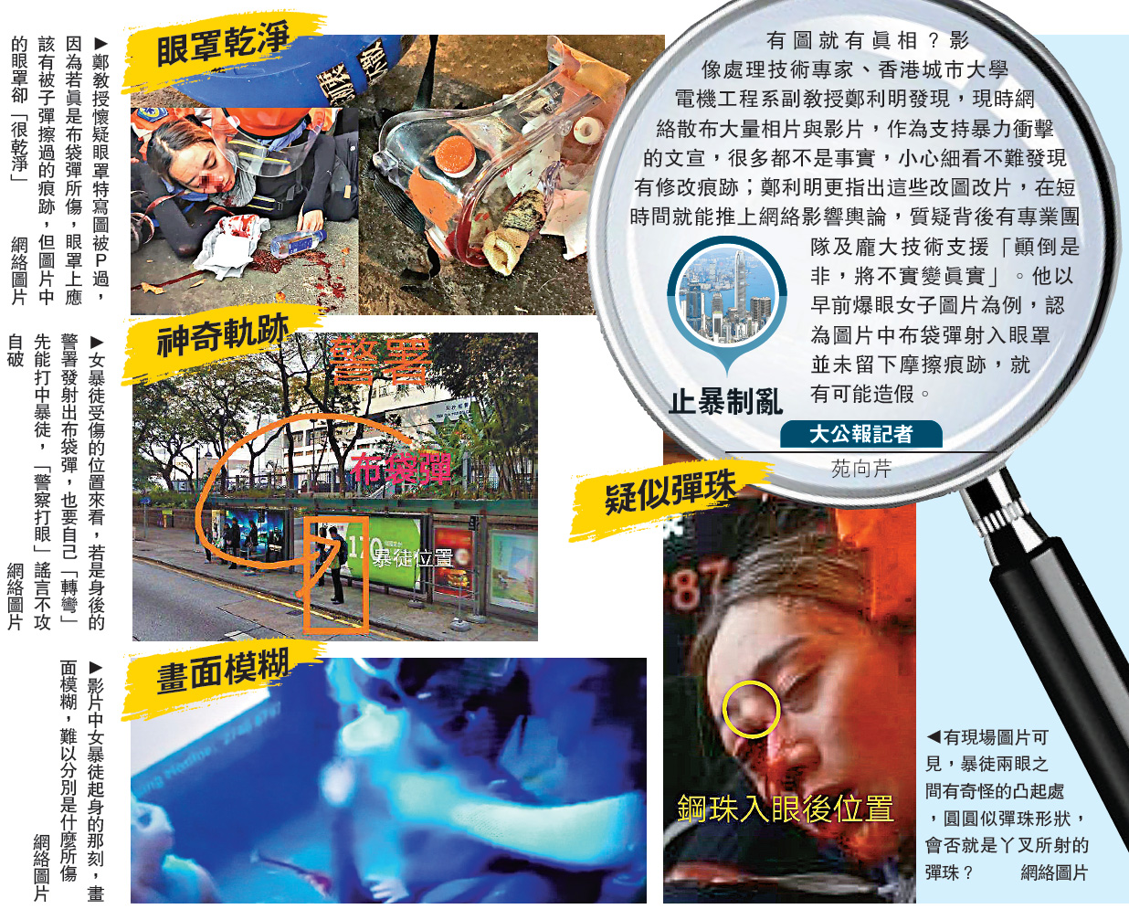 有圖就有真相?影像處理技術專家、香港城市大學電機工程系副教授鄭利明發現,現時網絡散布大量相片與影片,作為支持暴力衝擊的文宣,很多都不是事實,小心細看不難發現有修改痕跡;鄭利明更指出這些改圖改片,在短時間就能推上網絡影響輿論,質疑背後有專業團隊及龐大技術支援「顛倒是非,將不實變真實」。他以早前爆眼女子圖片為例,認為圖片中布袋彈射入眼罩並未留下摩擦痕跡,就有可能造假。
