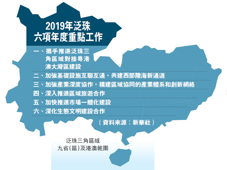 【大公報訊】記者黃寶儀、曾萍南寧報道:2019年泛珠三角區域合作行政首長聯席會議6日在廣西南寧舉行,會上確定了泛珠三角區域合作六大本年度重點工作。