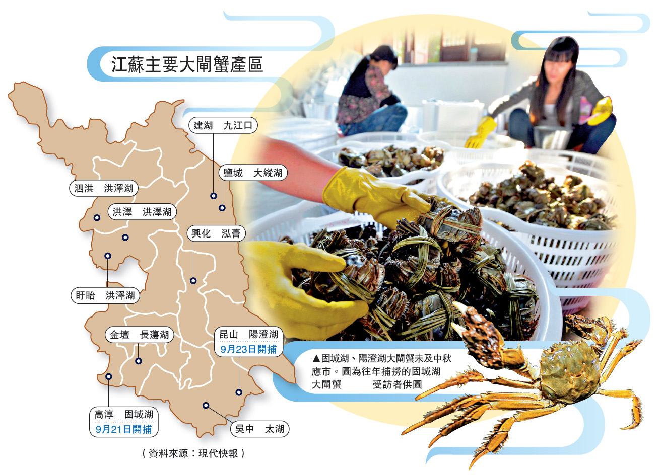秋風起,蟹腳癢,又到了品嘗大閘蟹的黃金季節。今年港人熟悉的江蘇大閘蟹產區如固城湖、陽澄湖開捕時間晚於往年,預計9月下旬才正式開捕,10月初大量上市,不過品質產量有望好於往年且價格略有下降。目前已有香港經銷商提前簽訂承銷協議,但中秋佳節本港市民將無緣品嘗到正宗的江蘇大閘蟹。\大公報記者 賀鵬飛南京報道