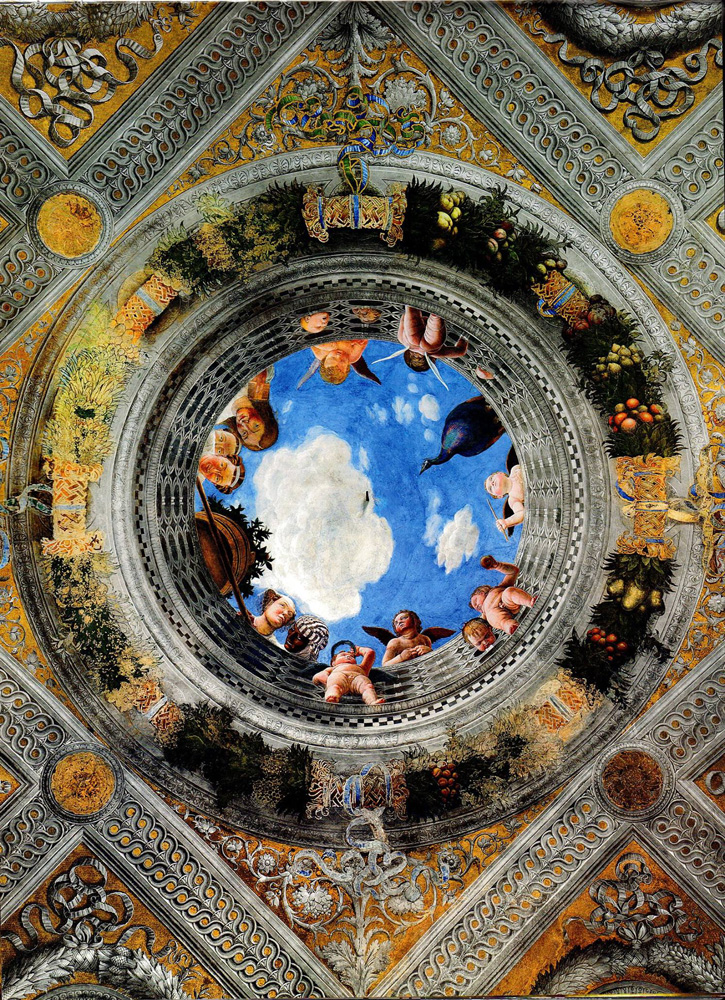 對透視法和幾何學有着透徹研究的十五世紀文藝復興畫家安德雷亞.曼特尼亞在受聘於曼圖亞公爵時,為公爵府的婚禮堂創作了一系列濕壁畫。其中繪製於房中的圓孔天頂畫不僅成為其最富盛名的代表作;還將幻想天頂畫這一常出現於古羅馬藝術,由室內真實空間向想像空間延伸的錯視畫法徹底復興。在藍天白雲的偽天空背景下,曼特尼亞將畫中一群小天使們以其最擅用的前縮透視法安置在屋頂看似作為室內整體設計延伸的石質圍欄內外兩側,或靠在圍欄外沿、或低頭向室內觀望。一隻探出多半個身子的孔雀和一半懸空架在圍欄邊緣的橙子樹盆栽強化了畫面的透視錯覺,其效果試圖模擬羅馬萬神殿頂端的圓洞,使得觀者站在原本密閉的室內空間中有一種「開天窗」的錯覺。