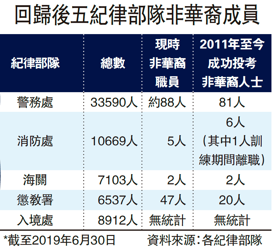 懲教署表示,現時有47名非華裔懲教人員,過去九年共有20名非華裔人士成功獲聘。入境處稱,按紀錄未有非華裔申請者成功投考,而甄選過程中,投考人士的種族並非考慮因素。海關表示,根據紀錄,去年共有兩名非華裔人士成功投考關員,已完成基本訓練課程,投入前線工作。