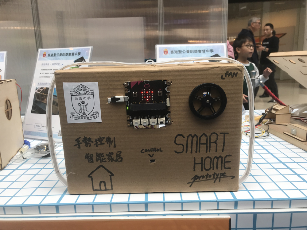 聖公會何明華會督中學梁老師:家裏電器多,就要好多個掣控制,一個個按很麻煩。於是根據紅外線感應原理,設計能用手勢控制的智能家居。例如,在控制鍵附近用手畫圈,燈就會亮,手來回搧動則風扇會轉。