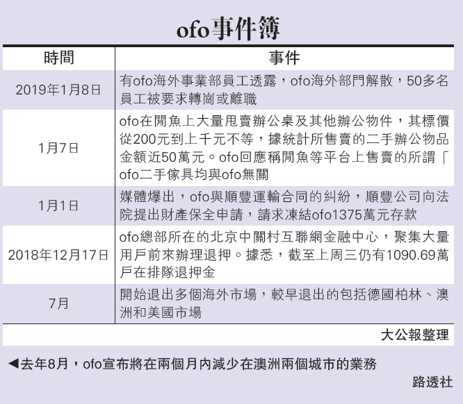□去年中已流出小黃車ofo逐步撤出海外市場的消息,而昨日有內媒引述來自其內部員工消息指,ofo海外事業部總經理Jeremy Chen(陳鈺瑄)昨日上午宣布部門解散,涉及50多名員工。ofo隨後表示,這為正常業務調整。據悉,目前ofo海外事務部還在中國香港、新加坡、美國、法國、意大利及英國等國家和地區還有業務,未來這些業務的後續處理方法仍未有定案。\大公報記者 王芳凝