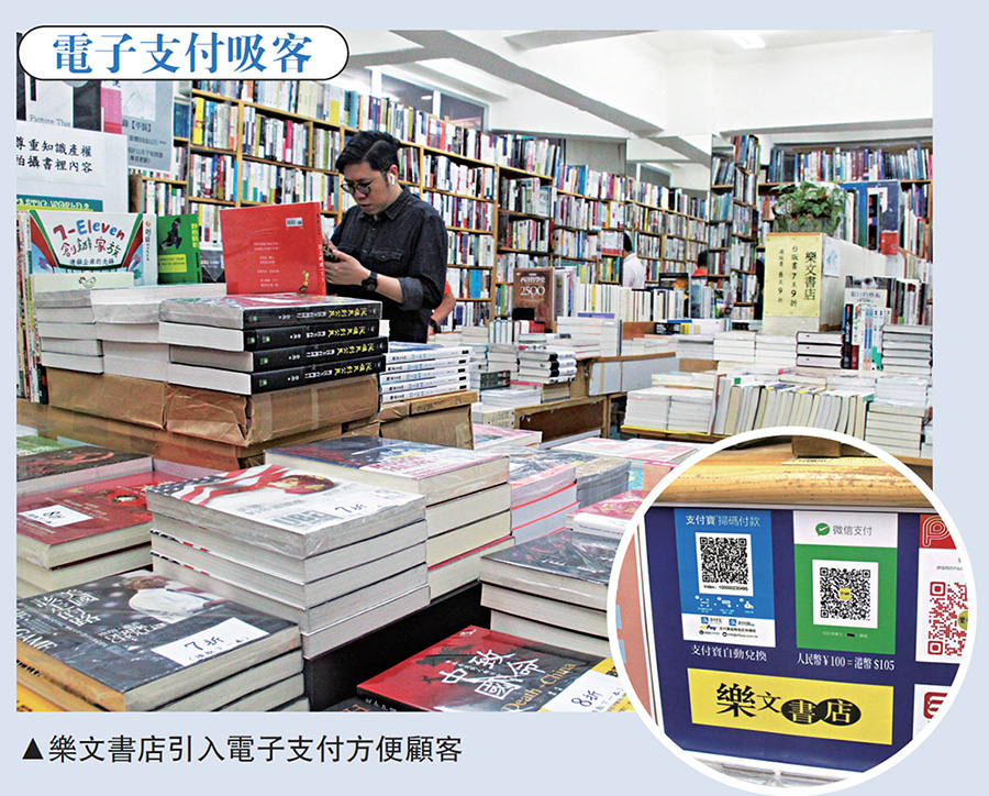 「依家內地仍然缺乏文史哲類書籍,所以好多內地客落嚟,都鍾意嚟買一堆關於心靈勵志、生活健康嘅書返去,唔介意呢啲書係繁體字。多咗呢批生力軍,令生意可以維持得過去。」吳口裏雖說着書業已「無得做」,心裏卻又捨不得讓書店「摺埋」。為方便客人購書,他特意在書店引入電子貨幣付帳,方便內地客付款。