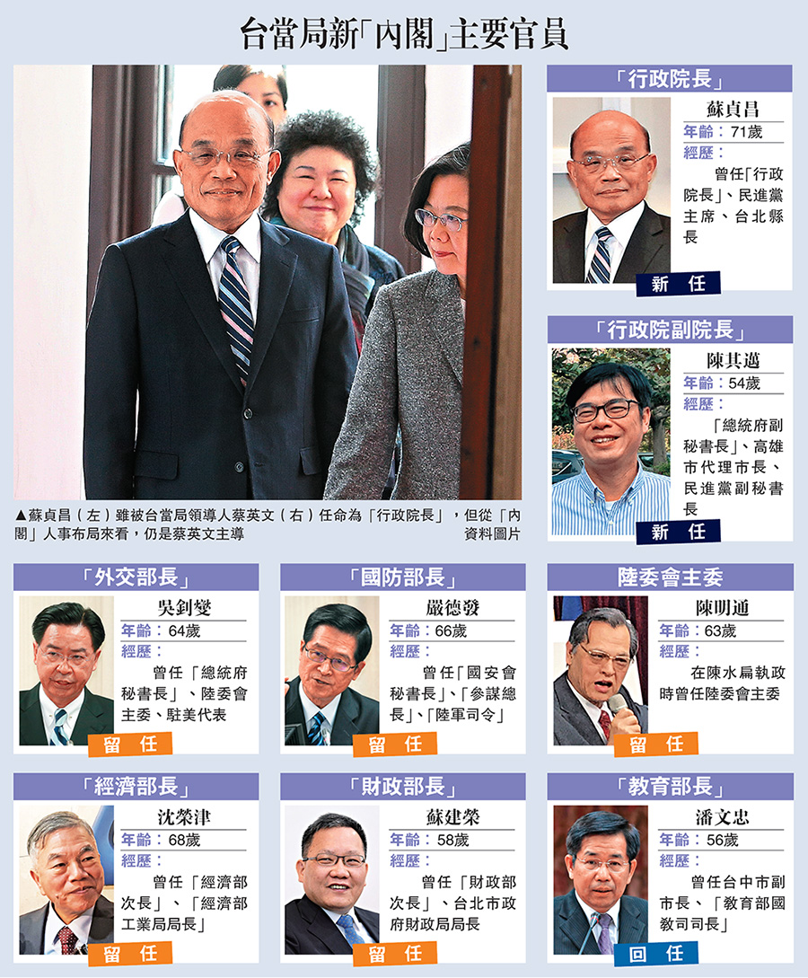 蘇貞昌將於14日接任台灣「行政院長」。13日「內閣」人事出爐,超過三分之二官員留任。島內學者指出,蘇「內閣」基本就是「回收瓶加舊酒再加一點新的調味料」而已,這樣的「新酒」與台灣老百姓的期待顯然有距離,可見民進黨並沒有認真檢討「九合一」敗選的原因,而是仍以選舉作為首要考量,以穩住領導中心為第一要務,而非以民生經濟為先。/綜合大公報記者何德花及中通社報道