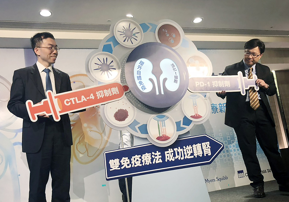 圖:台大醫院腫瘤醫學部醫師蔡育傑(左)向傳媒介紹「雙重免疫檢查點抑制劑」併用療法/中央社