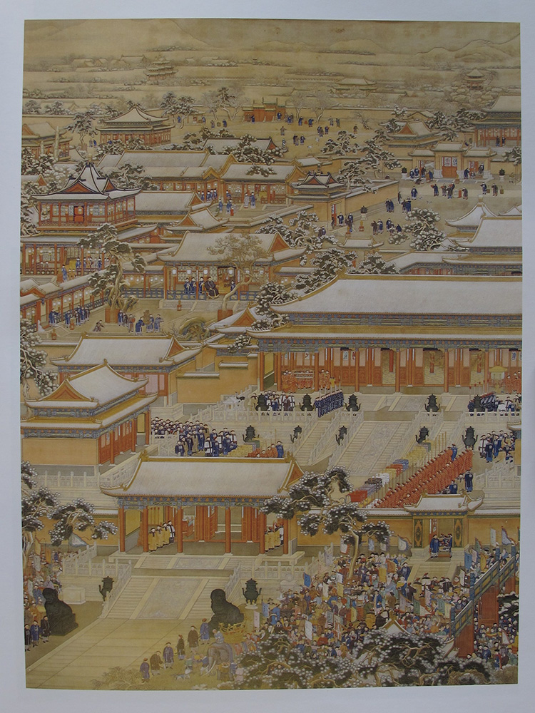 圖一為清宮舊藏《萬國來朝圖》軸。金碧輝煌的紫禁城,元旦晴雪初霽,覆蓋着一層積雪。文武大臣在太和殿等候朝參,太和門外馴象佇立,各地奇珍異寶,梯山航海來在闕下。皇帝端坐正寢乾清宮西小院的正式餐廳弘德殿,象徵性用過新一年第一頓正餐的餃子(交子),正等待吉時起駕,接受「萬國來朝」。