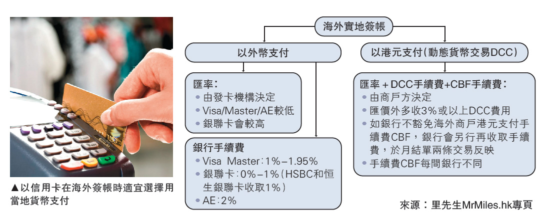 不少人在海外簽帳時,都面臨選擇港幣還是外幣找數的問題。里先生認為,若選擇港幣付款,即意味收款機構或商戶會在匯率上增加至少3%-4%的DCC費用,同時須額外支付1%的CBF。若選擇以外幣付款,除匯率外,還須視乎不同的發卡機構支付1.95%至2%不等的FCC,他直呼:「永遠都要揀當地貨幣,因DCC收費仲貴過銀行的外幣手續費。」但他強調,DCC是一個協議,這種情況只會出現在Visa和MasterCard上,銀聯和美國萬通均沒有這項協議。