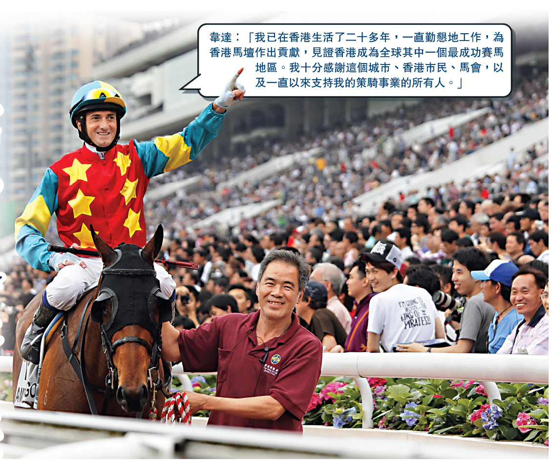 20多年來見證香港經濟繁榮、回歸後「馬照跑」的騎師韋達,今日會上演掛靴告別戰。這位深受馬迷擁戴的傳奇騎師,1996年起便以香港為家,曾連續13季成為香港冠軍騎師,累積頭馬逾1800場,坐騎累積獎金近16億元,其驕人紀錄相信短時間內難被打破。騎而優則練,韋達已獲馬會發出練馬師牌照,「十三少」將續追香港夢,在練馬事業上再創輝煌,在國際馬壇上繼續為港爭光。/大公報記者 周峻峯 楊州